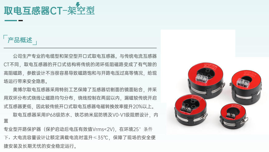 本互感器选用导磁率较高的优质进口硅钢片作为导磁材料,具有铁芯可分裂,磁通损耗小,便于安装等特点,其半圆环型铁芯和二次绕组采用优质环氧树脂真空浇注在可阻燃的外壳中,开口处采用密封设计,防潮湿,防护等级可达IP68,开口结合处采用精密设备打磨,吻合度高,运行噪音低。性能稳定,无需维护,广泛应用于智能电网监测系统供电电源中。